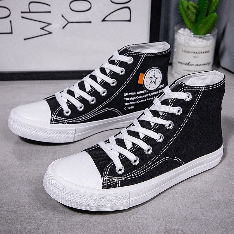 These classic high-top black canvas shoes blend style and functionality, adding a touch of cool to your everyday outfits. Crafted with premium canvas material, the upper is lightweight and breathable, ensuring long-lasting comfort. The white laces and toe cap contrast sharply with the black body, creating a minimalist yet distinctive look. The durable, non-slip rubber sole provides excellent traction, making it perfect for commuting, school, or casual outings. Whether paired with jeans, shorts, or skirts, these shoes effortlessly elevate your style, becoming a versatile staple in your wardrobe. Simple yet extraordinary, classic and timeless—an essential choice for your shoe collection!
