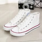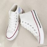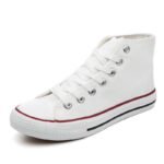 “These classic white high-top canvas sneakers are the ultimate blend of timeless style and everyday comfort. Featuring a durable canvas upper, breathable design, and a sturdy rubber sole, they are perfect for casual outings or completing your streetwear look. With their unisex appeal and versatile design, these sneakers are a wardrobe essential, offering both style and functionality for any season.”