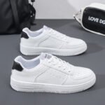 These classic all-white casual sneakers feature a minimalist and stylish design, combining comfort and practicality to suit any occasion. The upper is crafted from high-quality PU leather, making it soft, durable, and easy to clean. The perforated design on both sides enhances breathability, keeping your feet dry and comfortable for long periods. The lightweight rubber sole offers excellent anti-slip performance and durability, ensuring confident and steady steps with every stride.