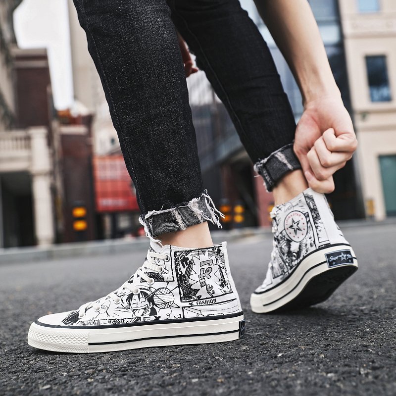These high-top canvas shoes feature a unique black-and-white anime pattern design, full of creativity and personality, perfectly showcasing the bold fashion attitude of young people. The upper is made of high-quality canvas material, which is breathable and durable, paired with a soft and comfortable insole for an all-day cozy wearing experience. The classic high-top style not only flatters the leg shape but also adds a distinctive trendy element to your outfit. Whether it’s street style, casual wear, or daily outings, these shoes are easy to pair with. More than just a pair of shoes, they are a combination of individuality and art. A must-have for anime and fashion enthusiasts!