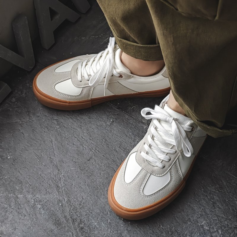 These white and light gray casual shoes draw inspiration from minimalist design and vintage style, offering the perfect combination of comfort and fashion. The upper features a blend of high-quality synthetic leather and suede materials, delivering a refined texture that’s durable and easy to clean. The classic brown rubber outsole adds a retro touch, showcasing understated elegance and timeless appeal. The soft, breathable inner lining conforms to your feet for all-day comfort, while the anti-slip, wear-resistant sole ensures stability and safety. Whether for daily commuting, casual outings, or trendy styling, these versatile shoes will keep you light on your feet and effortlessly stylish.