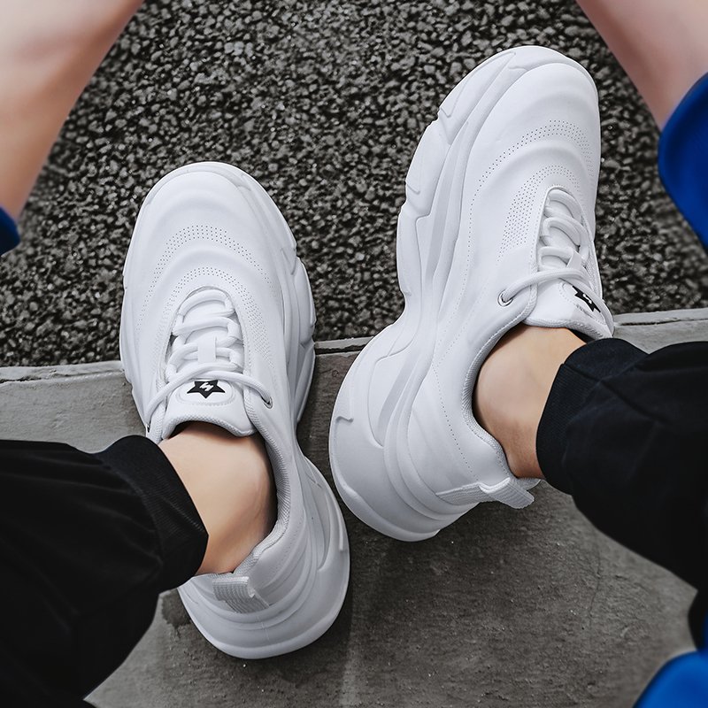 These all-white chunky sneakers stand out with their sleek and minimalistic design, perfectly blending modern trends with ultimate comfort. The upper is crafted from high-quality breathable materials, featuring smooth, streamlined lines that ensure all-day wearability without discomfort. The thick rubber sole provides excellent grip and stability while subtly elongating the legs for a stylish height-boosting effect. Whether for casual streetwear or everyday outings, these versatile sneakers are a must-have, combining lightweight comfort with effortless style to showcase your confidence anywhere, anytime!
