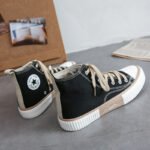 These vintage high-top canvas shoes feature a classic black base accented with beige laces and brown details, offering a stylish retro vibe. The upper is crafted from premium canvas material, providing breathable comfort and durability for all-day wear. The thick rubber outsole ensures excellent stability, grip, and wear resistance, while the signature-style design adds a unique touch. The high-top construction offers both warmth and style, making these shoes perfect for pairing with jeans, casual pants, and more. Ideal for daily wear and street fashion, they’re a must-have for any wardrobe.